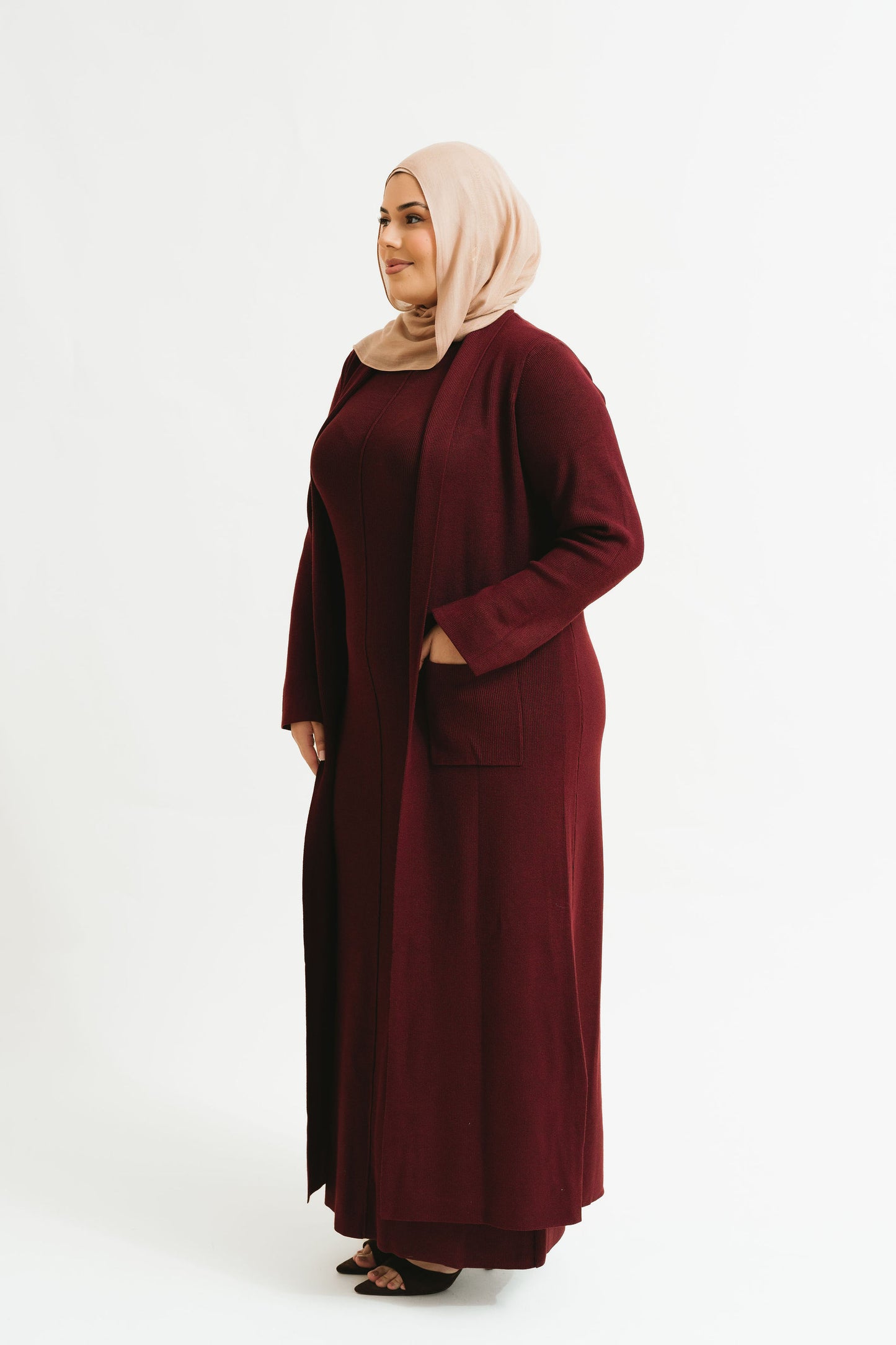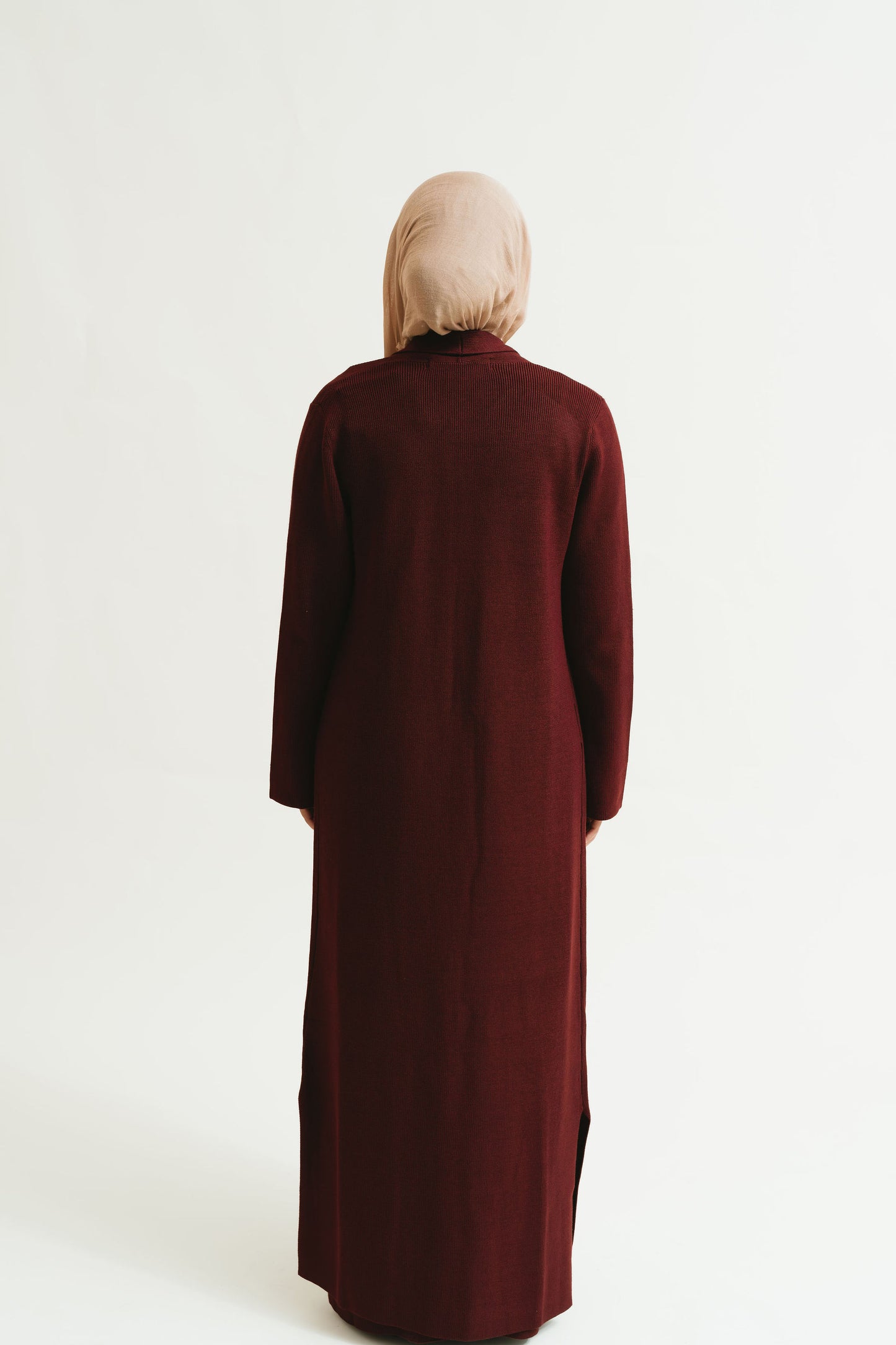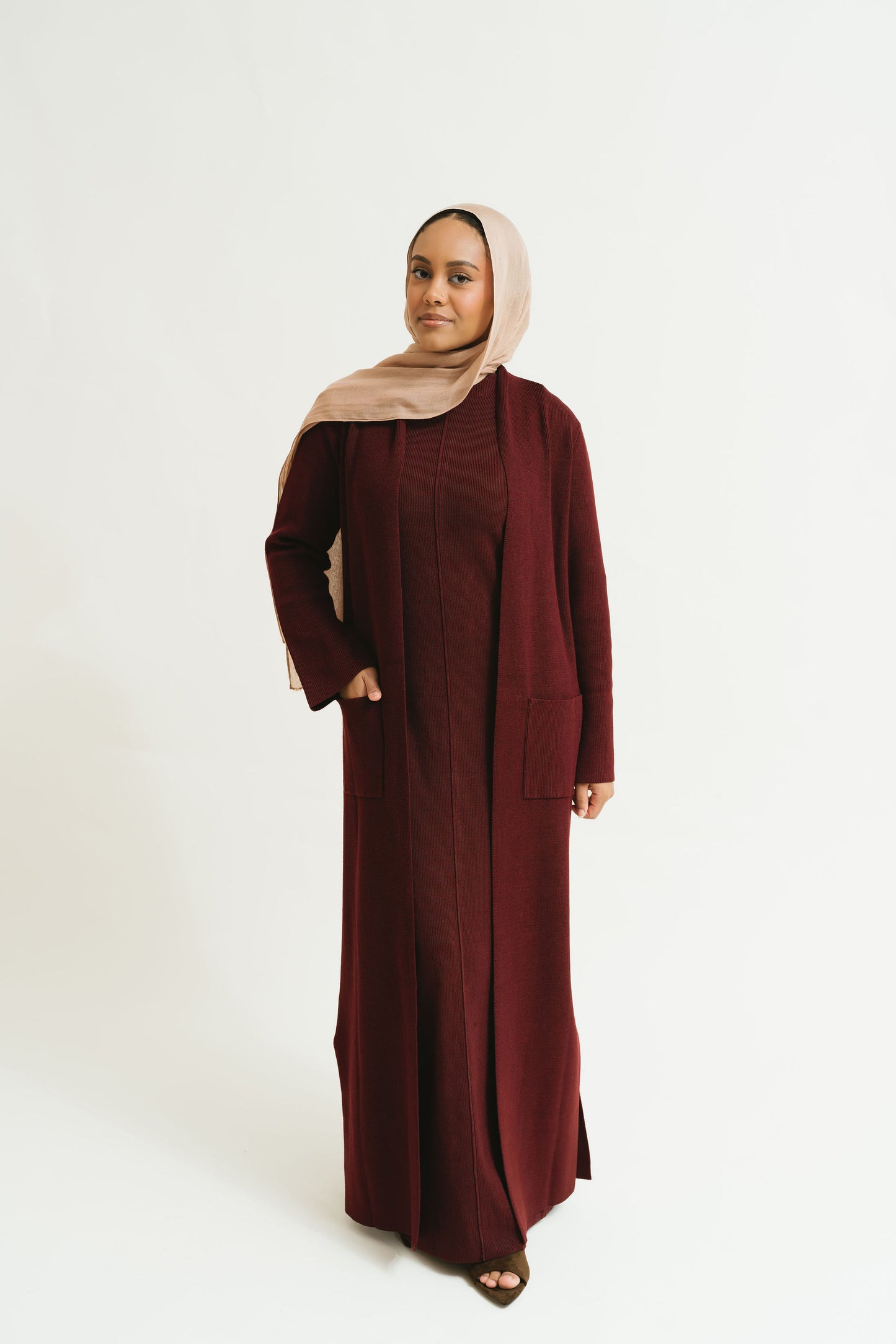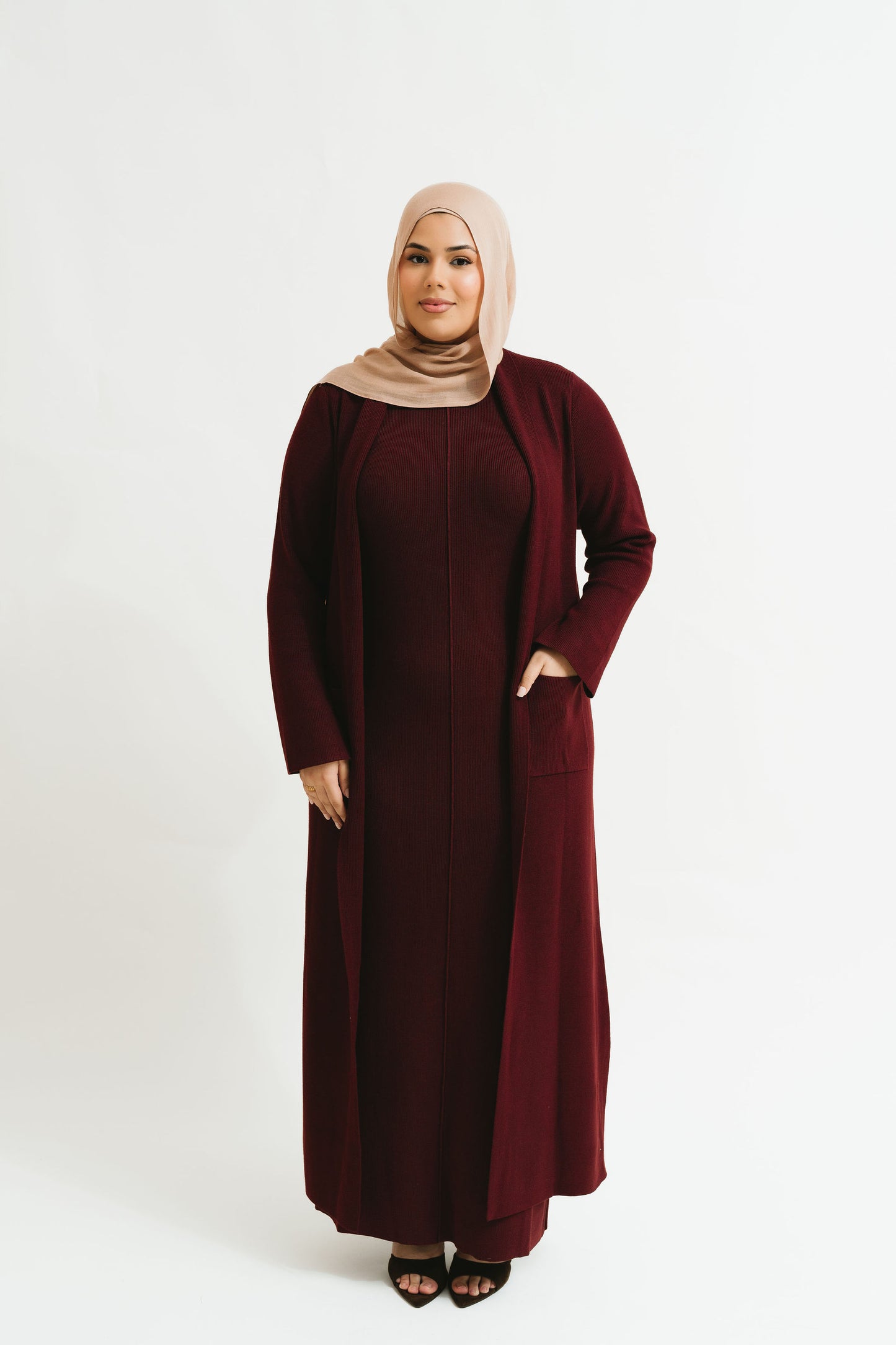 - Includes a sleeveless inner knit dress with a coordinating full-length cardigan