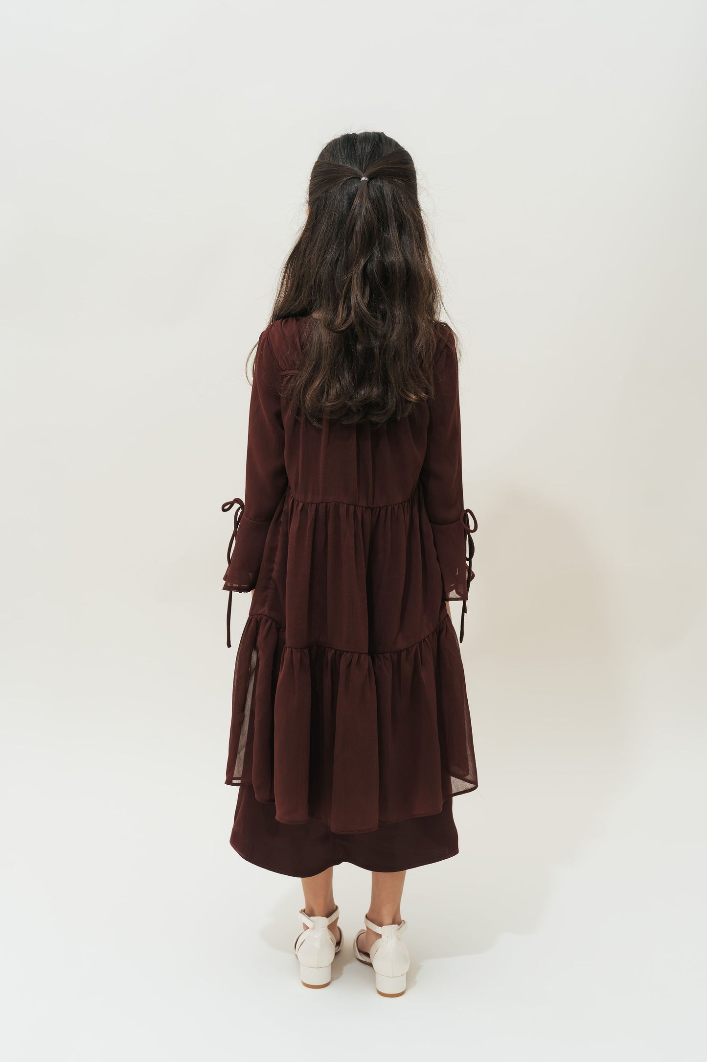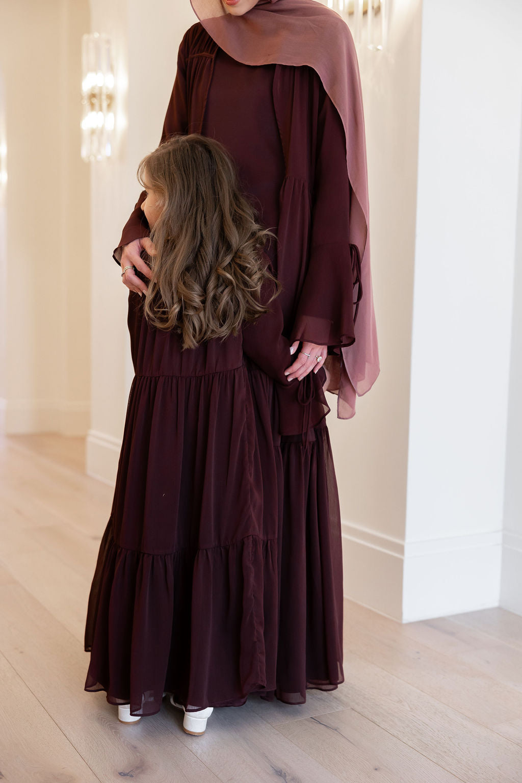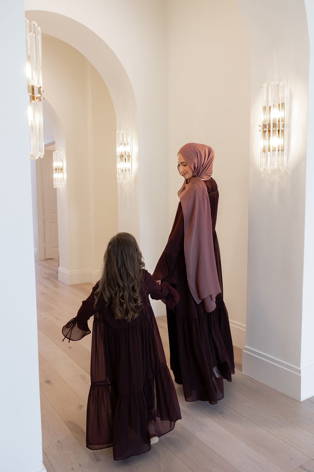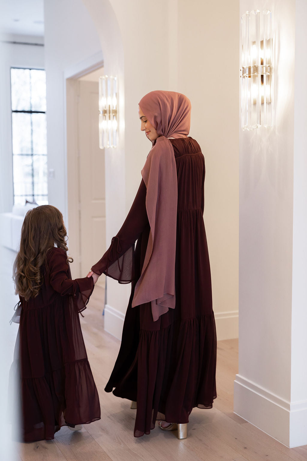 - Long-sleeve satin slip dress paired with a lightweight chiffon open abaya