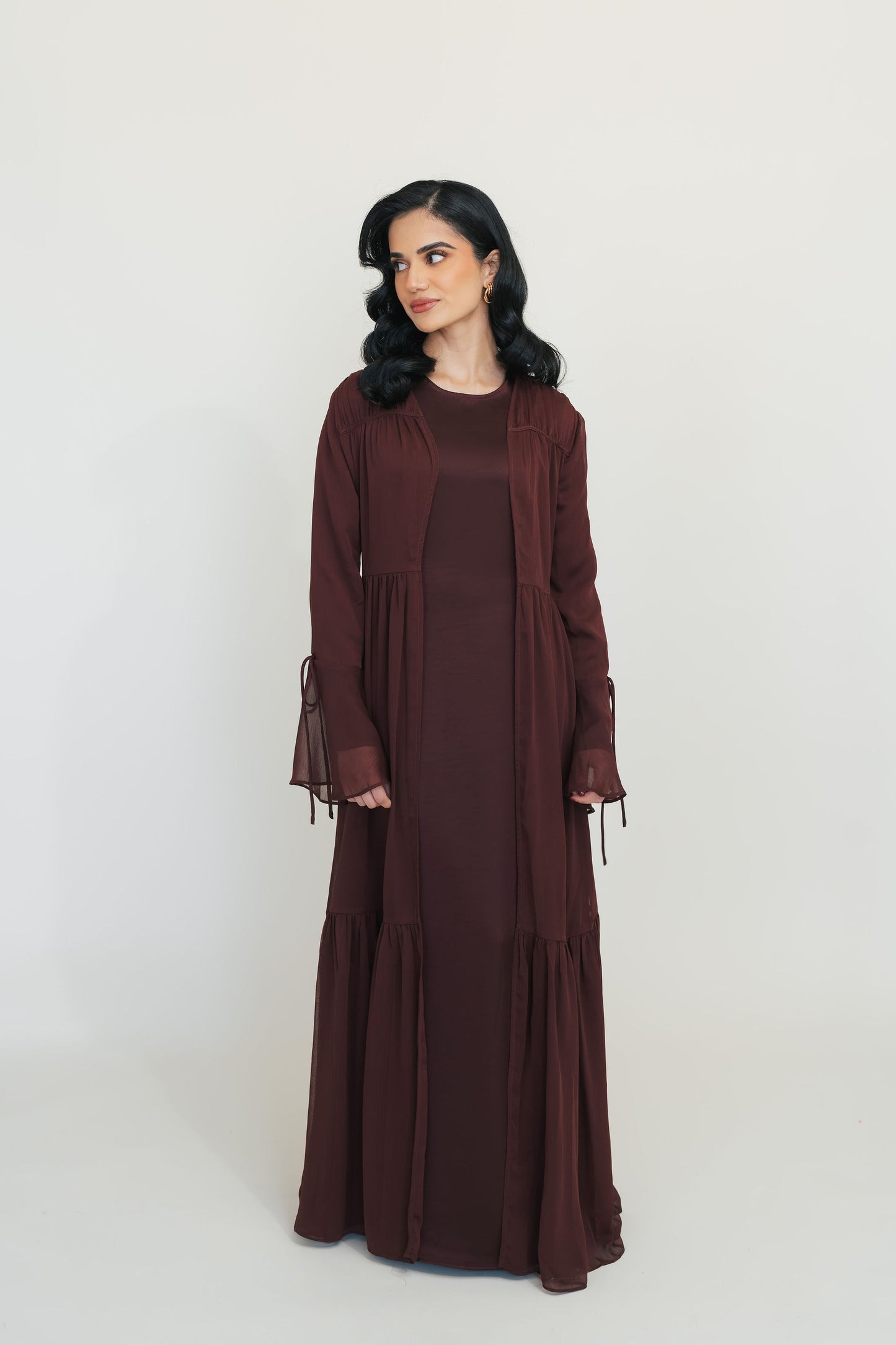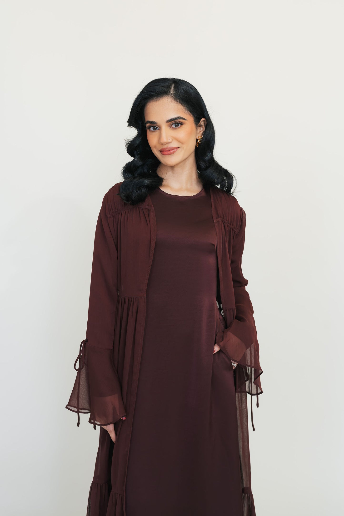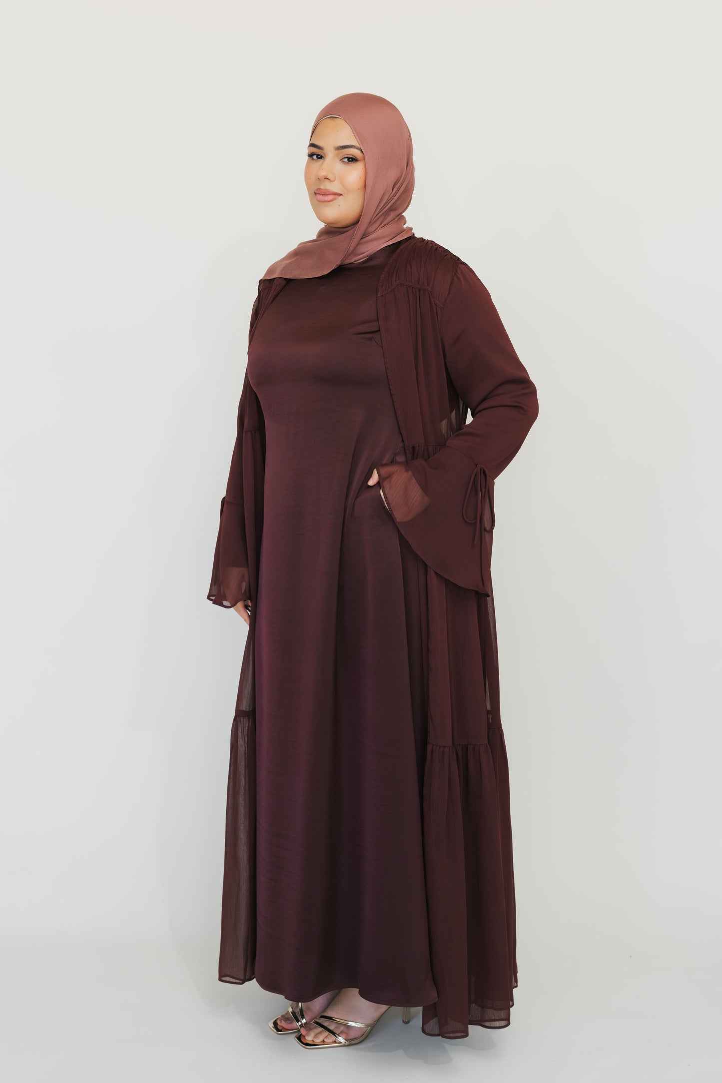 - Long-sleeve satin dress paired with a lightweight chiffon open abaya