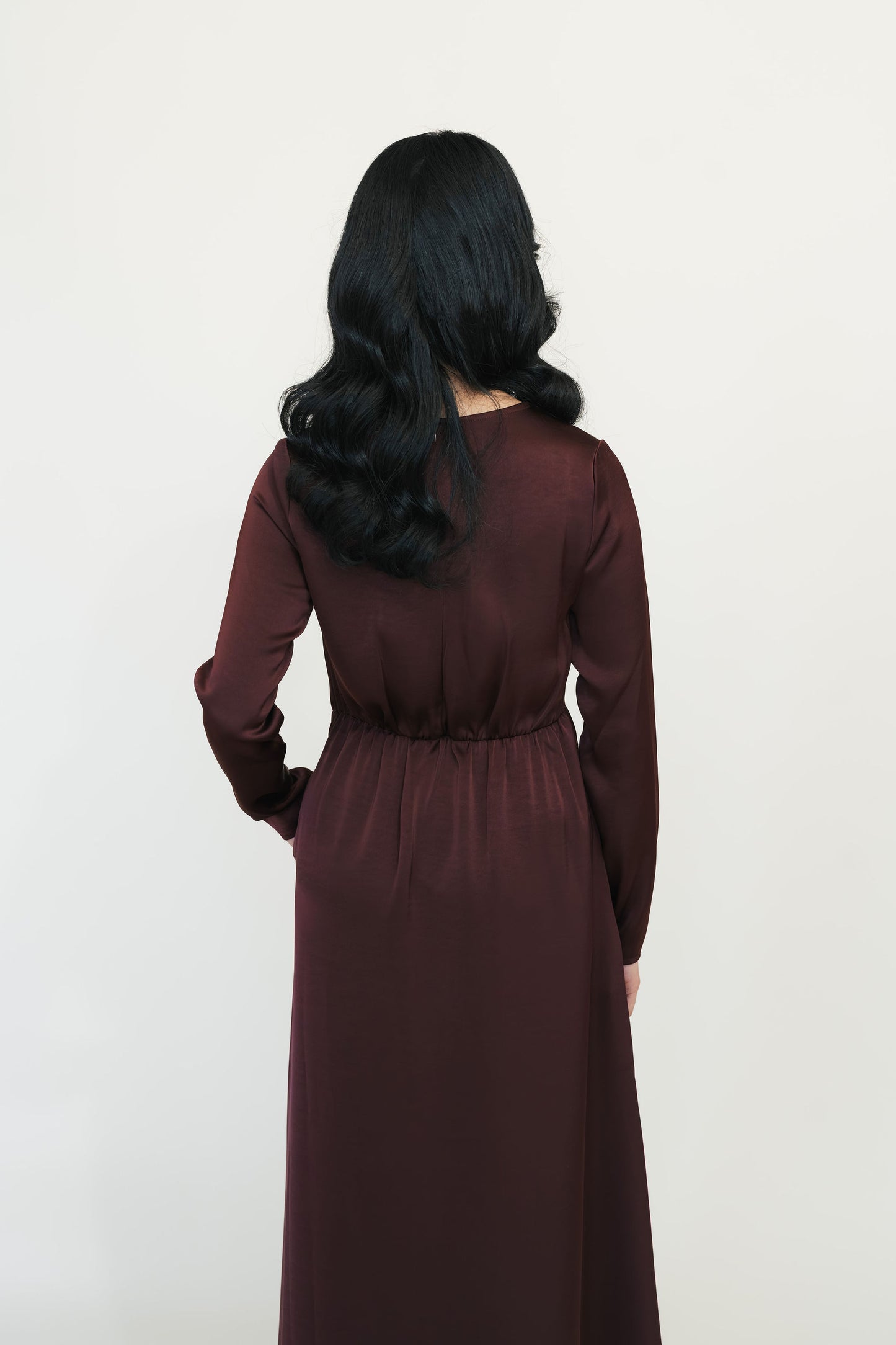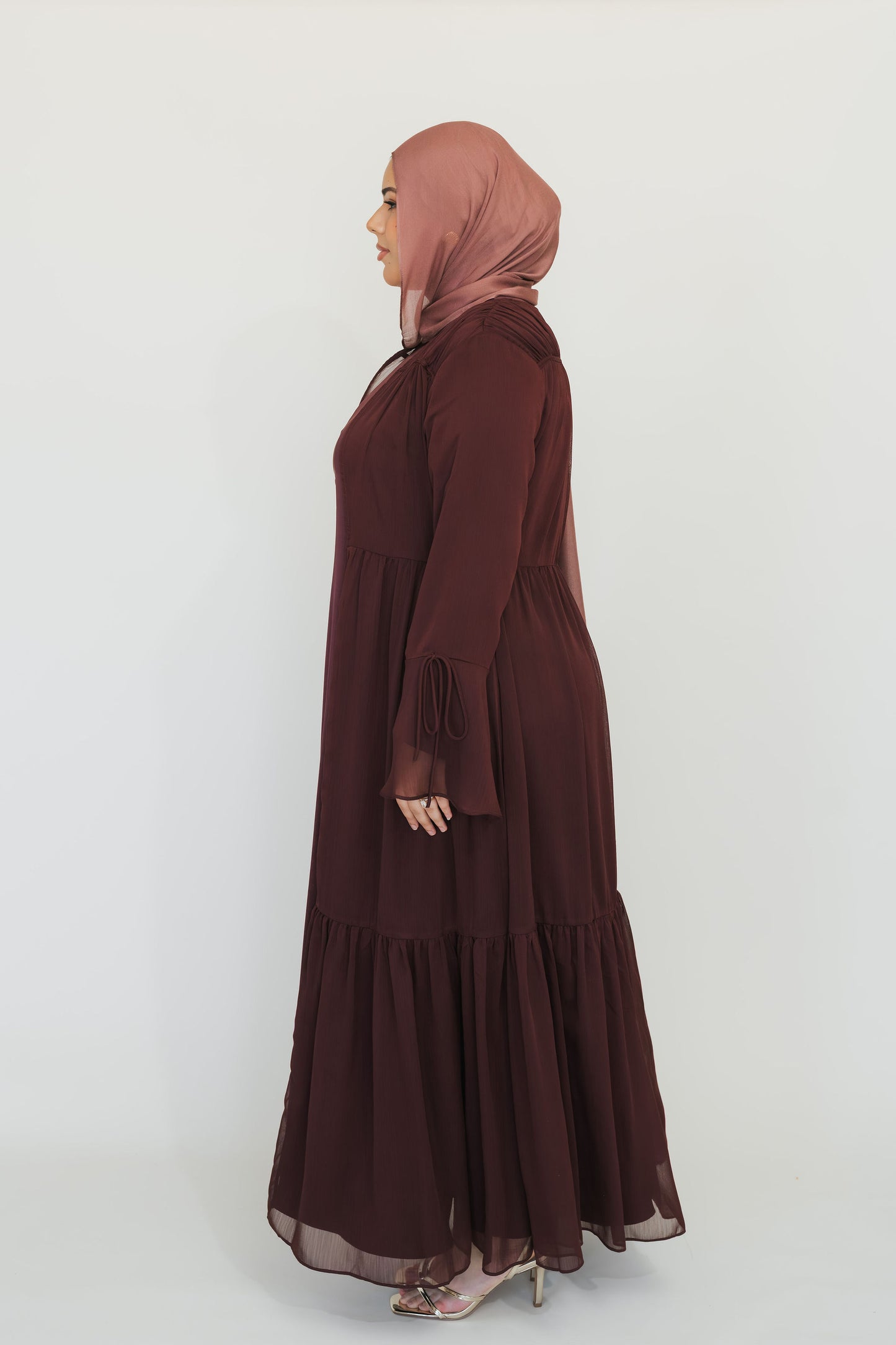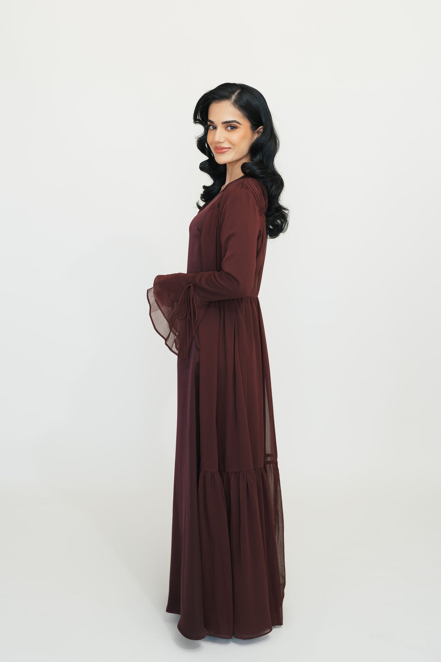 - Long-sleeve satin dress paired with a lightweight chiffon open abaya